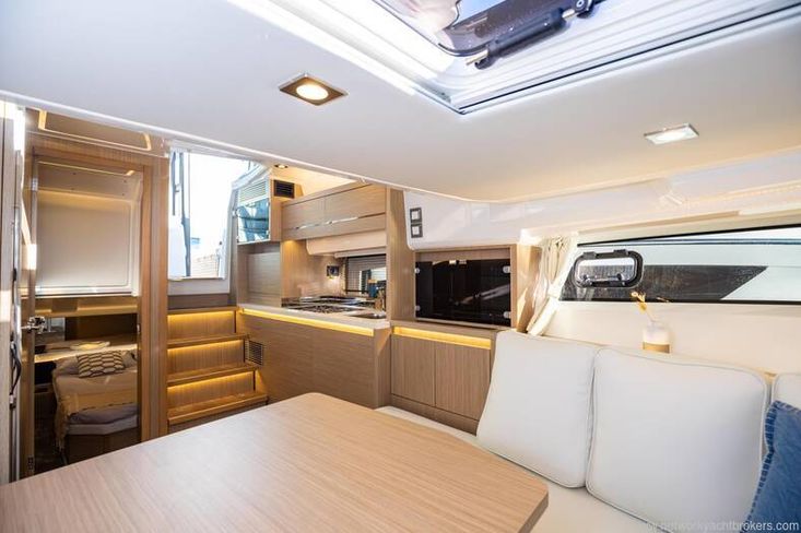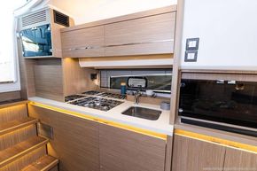 The galley on the port-side houses a sink, fridge, microwave as well and various storage compartments.