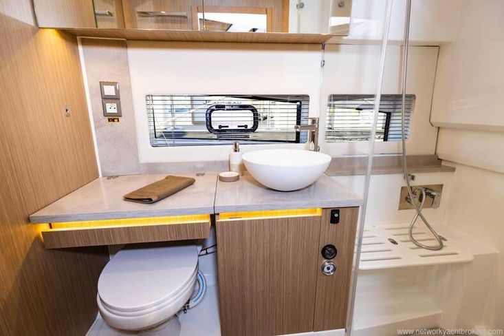 On the starboard side has the generous heads compartment that has a sink, marina fresh water electronic flush head, several shower compartment with shower screen enclosure.