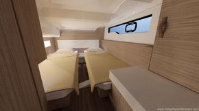 Two aft guest cabins, each with a double berth, opening portholes, and storage, ideal for family or guests