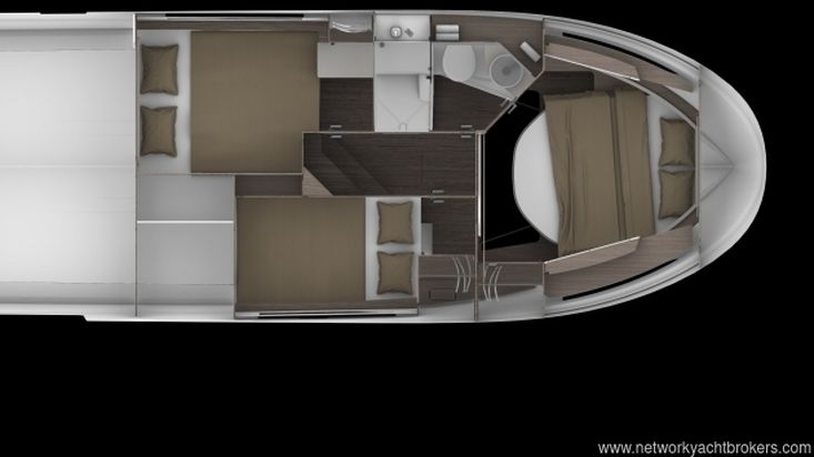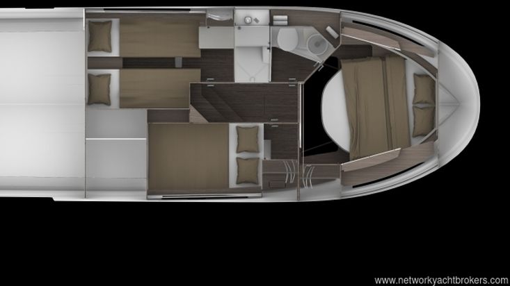 Forward owner’s cabin with a central double berth, storage lockers, reading lights, and direct access to the heads compartment